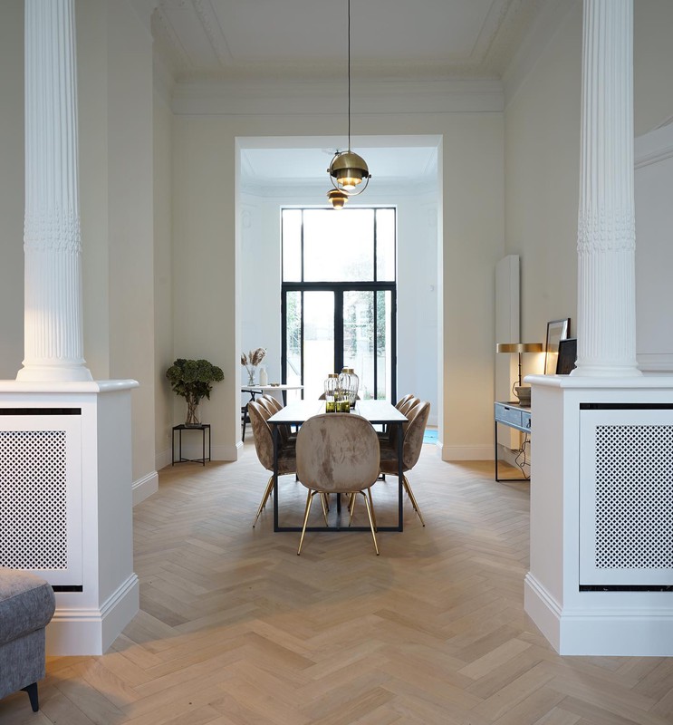 Tegels, parket of klikvinyl — correct geplaatst met mooie overgangen en passende plinten.